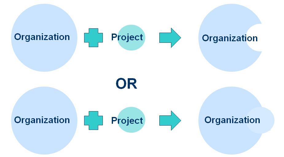 Do your projects take a bite out of your organization, or do they add to its overall capabilities? (I know, the resulting organization in the bottom equation looks like it has an unpleasant bump on it; but you get the idea.) Think about projects you’ve been involved with.